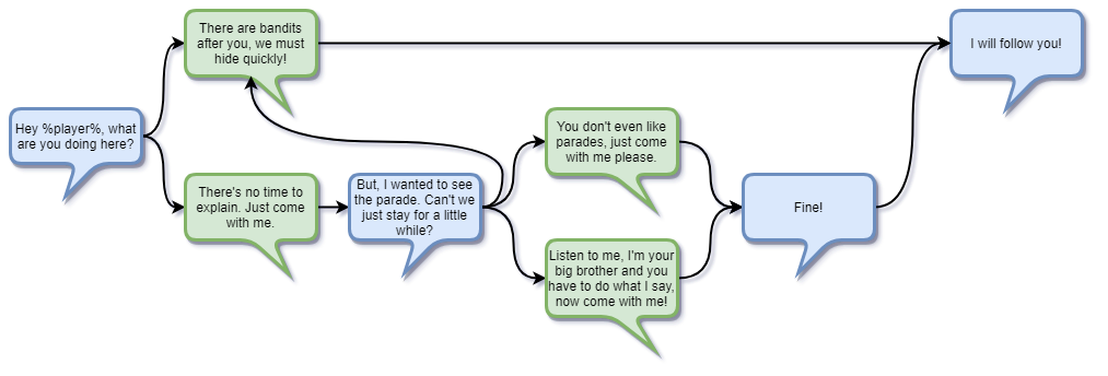 Here is where the wordsmith acrobatics really shine. While some games have multiple endings and several variations within, we will always want to create the illusion that a player has a effective choice to make, even if the result will be where we direct it. The most obvious place I saw this principal in regards to narrative design was dialog trees. An exchange like this might occur when our player finds their brother in the example: